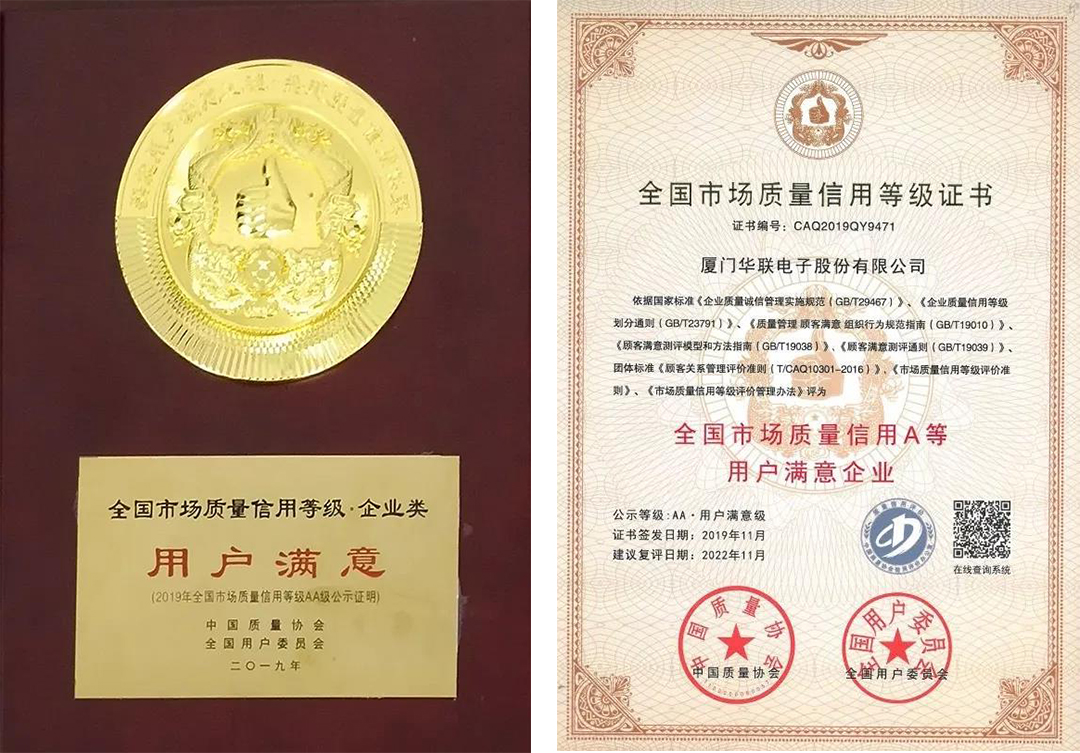 近日,中國質量協會、全國用戶委員會在珠海聯合舉辦“2019滿意中國年會”,會上發布2019年全國市場質量信用A等用戶滿意企業名單。名單依據《企業質量誠信管理實施規范(GB/T29467)》、《企業質量信用等級劃分通則(GB/T23791)》等多項國家標準選評,廈門華聯電子股份有限公司成功入選,公示等級為AA級。這已是華聯電子第四次獲得本項殊榮。