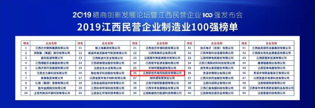 會上發布了2019江西民營企業100強、2019江西民營企業制造業100強名單,聯創光電均上榜,分別位列江西民營企業100強第49位、江西民營企業制造業100強第26位。聯創光電常務副總裁葉建青代表公司參會并領取獎牌。