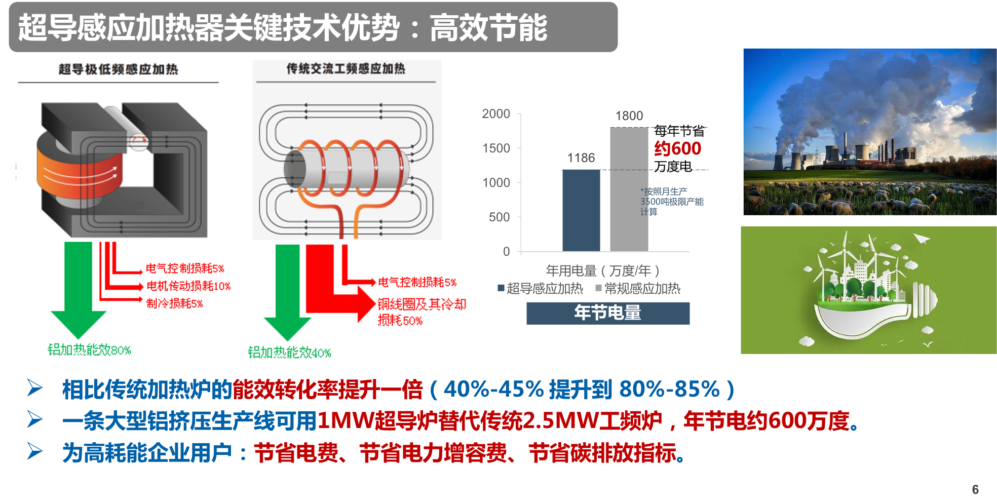 高效節能是這種加熱方法的最突出優勢。傳統的工頻爐,大量的熱能消耗在產生磁場的銅線圈上,并沒有注入工件體內,因此加熱效率只有不到50%。超導感應加熱,由于其零電阻特性,產生強磁場只消耗些低溫制冷損耗,加上機械傳動損耗在內,總損耗不會超過20%,因此可以將加熱能效大幅提升到80%以上。這就意味著一臺1mw的超導爐可以替代掉傳統2.5兆瓦的工頻爐,一年運行可為客戶節省600萬度電,除此之外,還能節省電力增容費,和未來的碳排放指標。