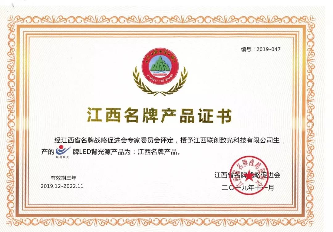 11月26日,江西省名牌戰(zhàn)略促進(jìn)會(huì)第二屆理事會(huì)三次會(huì)員代表大會(huì)暨2019江西名牌產(chǎn)品發(fā)布會(huì)在九江舉行。發(fā)布會(huì)上,全省285個(gè)產(chǎn)品獲“江西名牌產(chǎn)品”證書并集中進(jìn)行授牌。江西聯(lián)創(chuàng)致光科技有限公司生產(chǎn)的“聯(lián)創(chuàng)致光”牌LED背光源產(chǎn)品通過江西名牌戰(zhàn)略促進(jìn)會(huì)審定,榮獲“江西名牌產(chǎn)品”稱號(hào)。